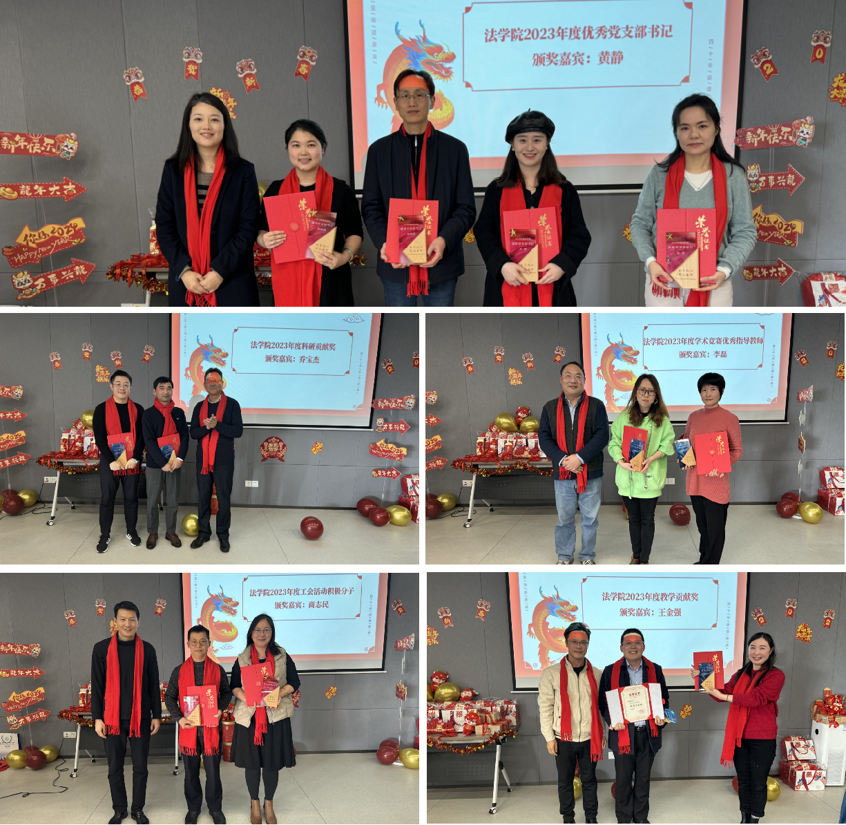 会上,法学院进行了2023年度的“优秀党支部书记”“科研贡献奖”“教学贡献奖”“学术竞赛优秀指导教师”“工会活动积极分子”颁奖,表彰各条战线的教师在2023年度对学院发展做出的重要贡献,同时激励全院教师奋勇前行。学院班子成员分别为他们送上证书和奖杯。