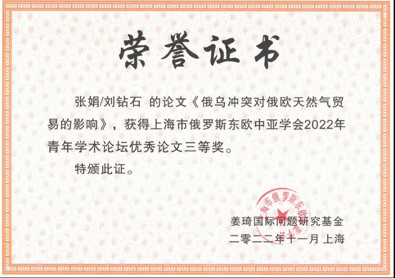 张娟副研究员研究成果《俄乌冲突对俄欧天然气贸易的影响》获得上海市俄罗斯东欧中亚学会2022年青年学术论坛优秀论文三等奖