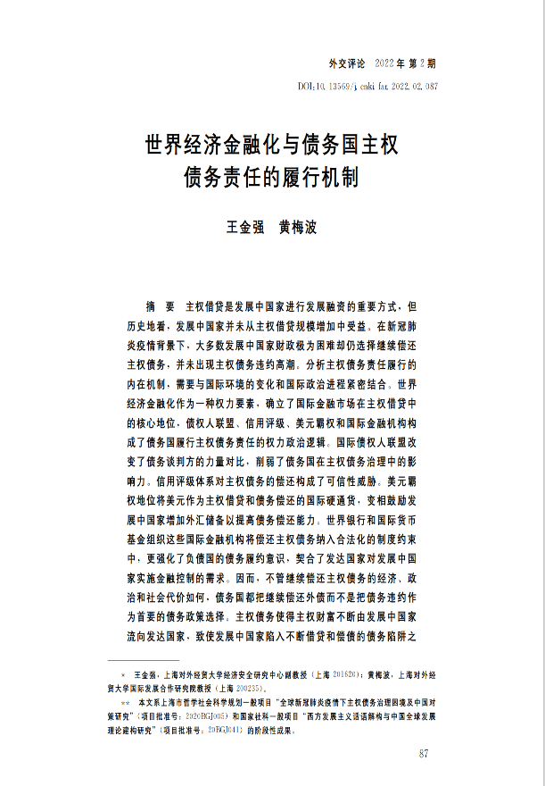 王金强、黄梅波,“世界经济金融化与全球主权债务责任的履行”,外交评论,2022年第2期
