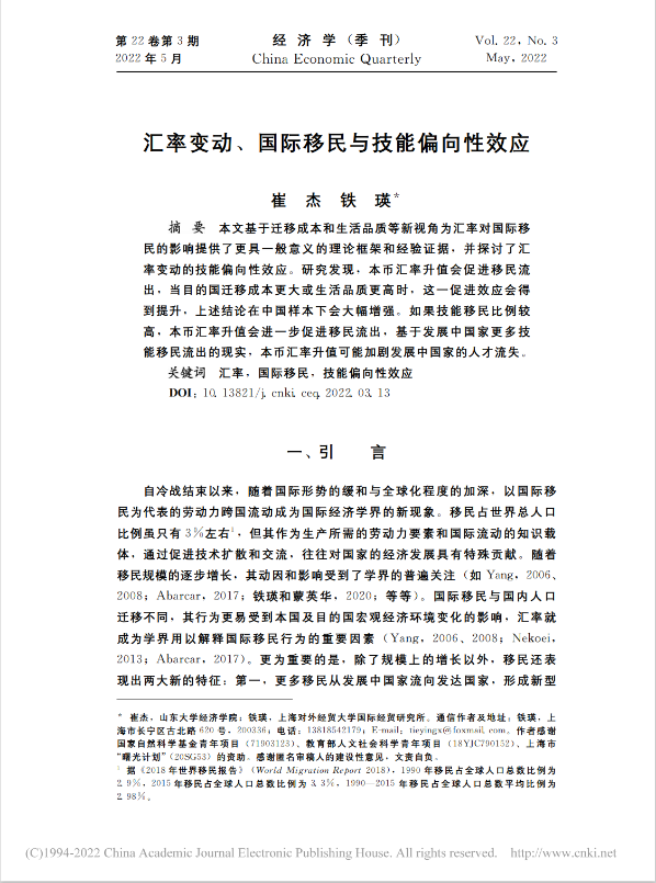 崔杰、铁瑛(通讯作者),《汇率变动、国际移民与技能偏向性效应》[J],经济学(季刊),2022第3期:997-1016.