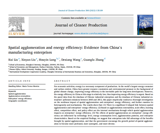 Kui Liu、Xinyan Liu、Houyin Long、Dexiang Wang、Guanglu Zhang,Spatial agglomeration and energy efficiency: Evidence from China’s manufacturing enterprise,Journal of Cleaner Production,2022(380).