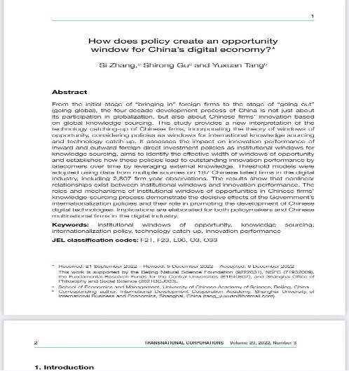Si Zhang, Shirong Gu and Yuxuan Tang (Corresponding author), How does policy create an opportunity window for China’s digital economy? Transnational Corporations, 2022, Vol 29, No.3.