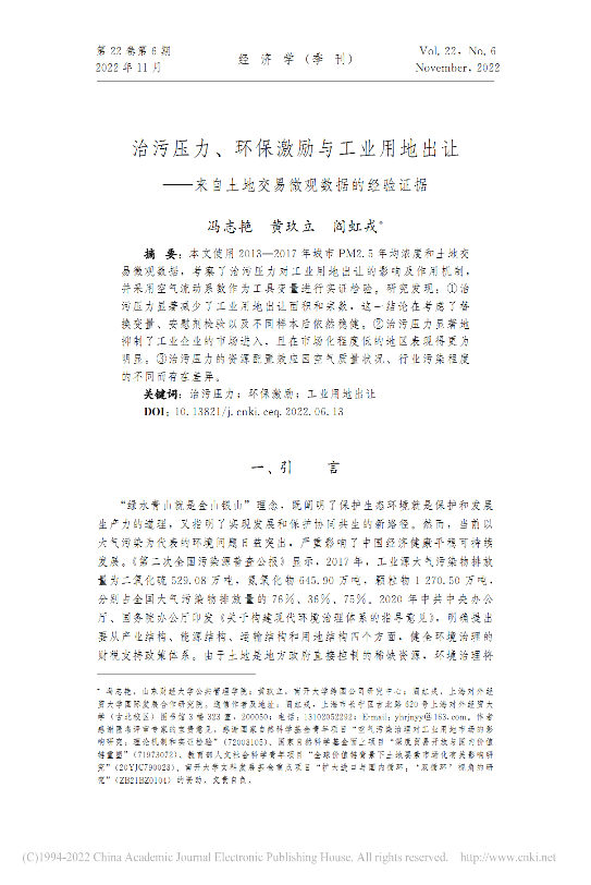 冯志艳,黄玖立,阎虹戎.治污压力、环保激励与工业用地出让——来自土地交易微观数据的经验证据[J].经济学(季刊), 2022,22(6): 257-278.