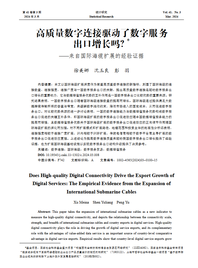 徐美娜, 沈玉良, 彭羽. 高质量数字连接驱动了数字服务出口增长吗?——来自国际海缆扩展的经验证据[J]. 统计研究, 2024, 41 (03): 100-114.