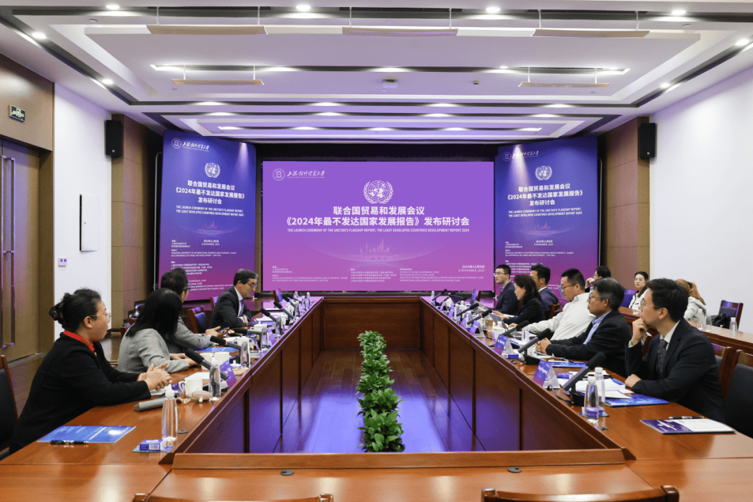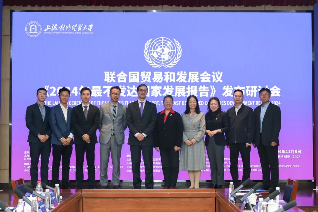 11月8日,联合国贸易和发展会议《2024年最不发达国家发展报告》发布研讨会在上海对外经贸大学古北校区综合楼510会议室顺利举行。本次研讨会的主题为“新时代绿色发展合作与全球气候治理”,由上海对外经贸大学与联合国贸易和发展会议共同主办,上海对外经贸大学国际组织学院(贸易谈判学院)、世界贸易组织讲席(中国)研究院、国际经贸创新与治理研究院、国际发展合作研究院联合承办。