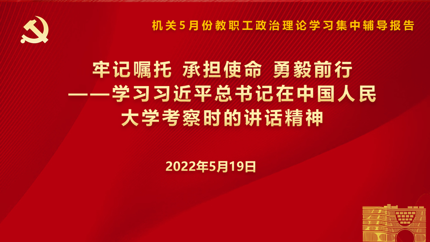 5月19日,国际经贸研究所全体教职工参加了以“牢记嘱托 承担使命 勇毅前行——学习习近平总书记在中国人民大学考察时的讲话精神”为题的机关5月份教职工政治理论学习集中辅导报告会,会上传达了要学习习近平总书记在中国人民大学考察时的重要讲话精神。在五四青年节即将到来之际,习近平总书记到中国人民大学考察调研并发表重要讲话,充分体现了对教育工作的高度重视、对广大青年的殷切期望,要认真学习领会。习近平总书记强调“为谁培养人、培养什么人、怎样培养人”始终是教育的根本问题。要落实党的领导,坚持马克思主义指导地位,坚持为党和人民事业服务,落实立德树人根本任务,传承红色基因,扎根中国大地办大学,走出一条建设中国特色、世界一流大学的新路。
