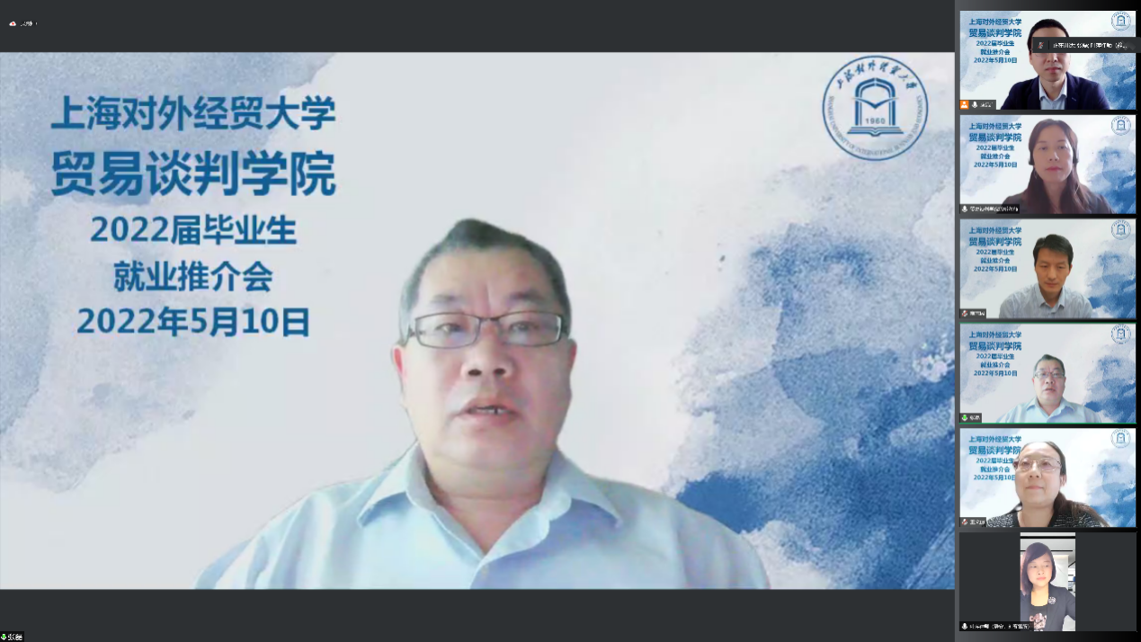 为广泛开拓就业渠道和就业岗位,促进毕业生就业工作,5月10日下午贸易谈判学院通过视频会议形式举办2022届毕业生就业推介会,架好访企拓岗线上“云梯”,吸引多家用人单位参加,推动了就业供需有效对接。贸易谈判学院全体老师出席会议,一起为学生“代言”、向企业问需,为毕业生争取成功求职机会。启动仪式由徐昕副院长主持。