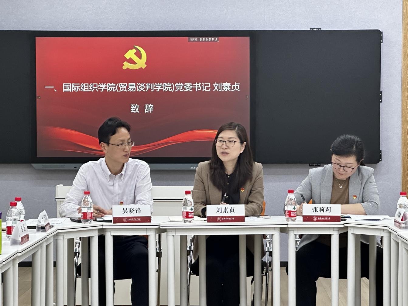 国际组织学院(贸易谈判学院)党委书记刘素贞到会指导,并在致辞讲话中指出,中国共产党与中华民族伟大复兴”课程全面系统、内容重要,帮助师生不断提高思想觉悟、精神境界、道德修养。作为全国党建工作样板支部,国际关系学系教工党支部要积极发挥样板作用,主动加强党的创新理论学习,通过联组学习进一步深化对党的历史、理论和使命的认识,切实提升党员的政治素养和担当能力。希望2个支部通过牵手共建,共同加强理论学习,共同提升支部建设水平,增进彼此了解,让机关部处更好地了解和掌握一线基层老师的思想状况和做法建议,也可以通过共同探讨相互借鉴,为学校事业发展以及教师队伍建设和服务平台资源开拓创造更多空间。