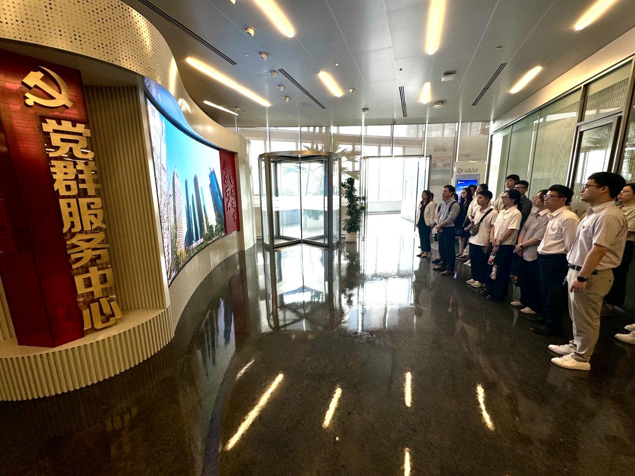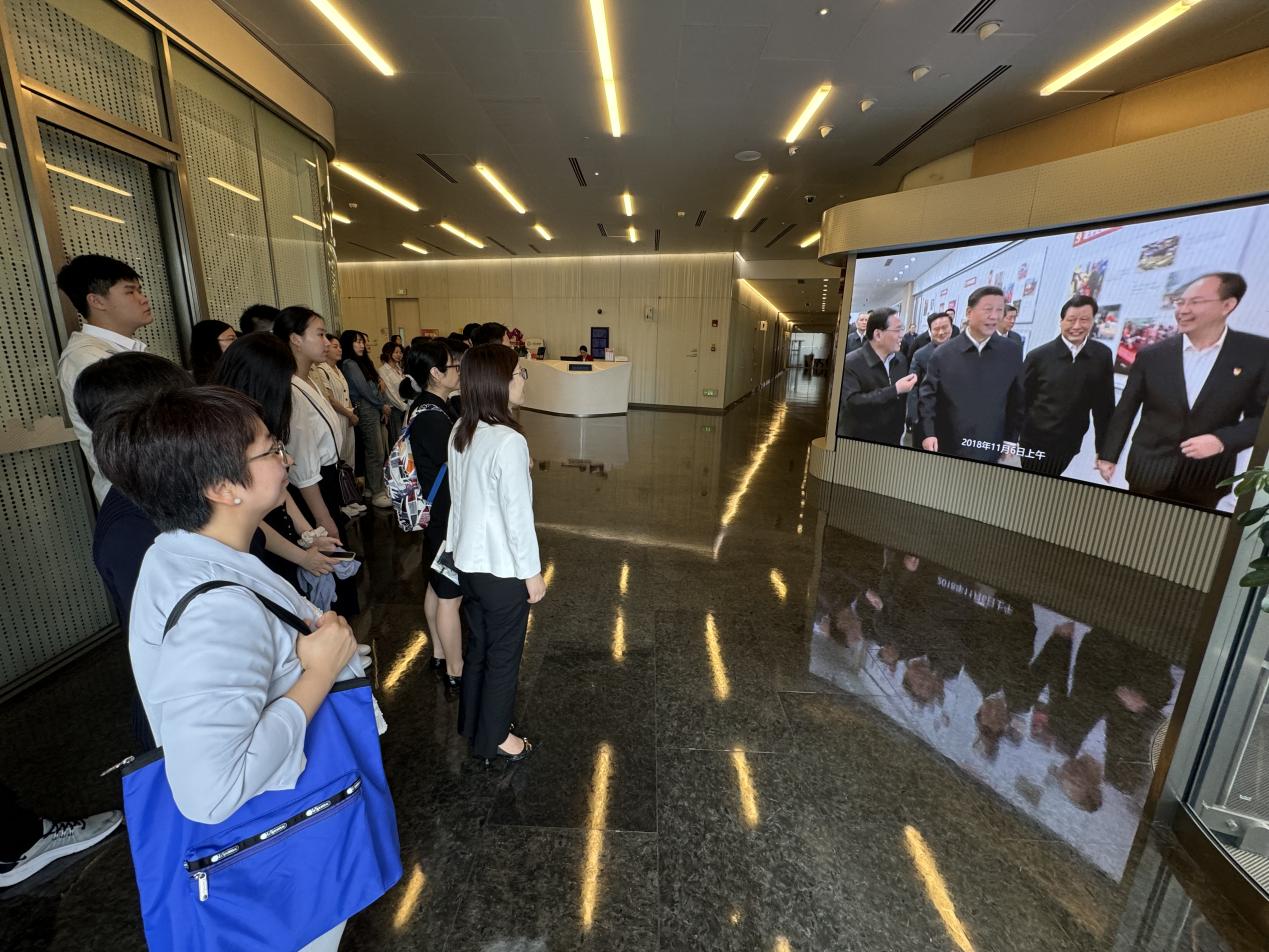 接下来,师生党员参观了位于上海中心大厦22层的陆家嘴金融城党群服务中心。大家通过观看宣传片,回顾了习近平总书记2018年亲临现场的情景,并详细了解了党群服务中心的建设。该中心面积约600平方米,分别设置宣传展示区、主题教育区、政治生活区、休闲活动区等区域,服务范围覆盖陆家嘴金融城各级各类基层党组织、全体党员和职工群众,以“交流、服务、凝聚、引领”为主要内涵,通过开展多元化的“党建+”服务等内容,充分发挥党建引领在招商引资、人才服务、经济发展中的作用。