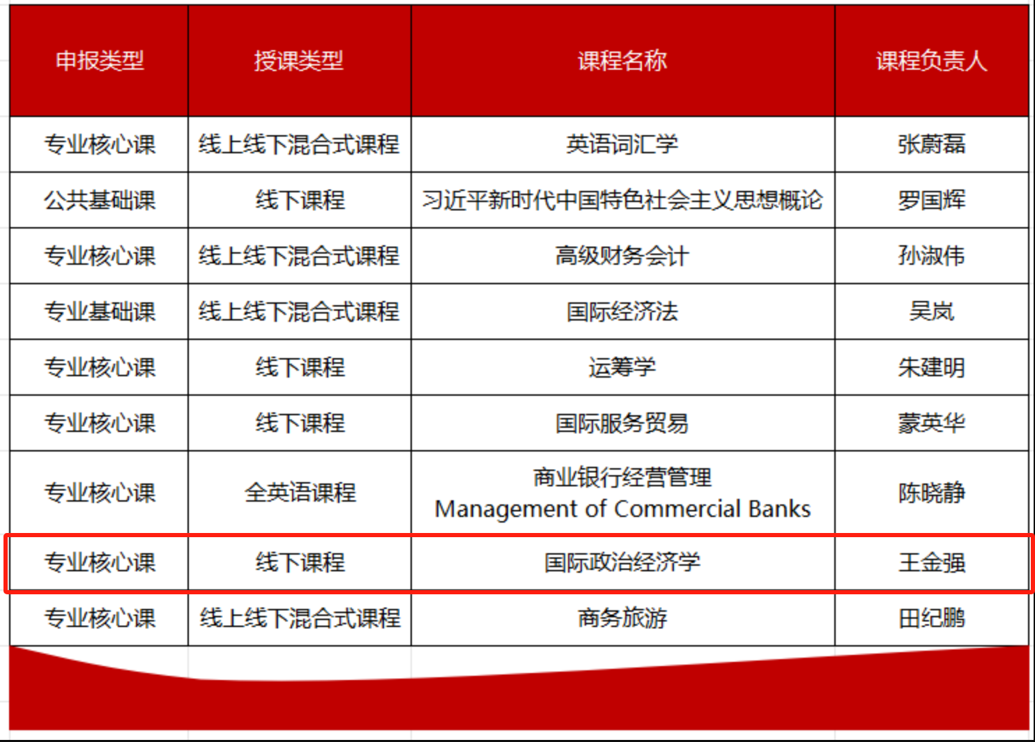 根据上海市教委发布的《上海市教育委员会关于公布2024年度上海高校市级一流本科课程认定结果的通知》(沪教委高〔2025〕5号),上海对外经贸大学共有9门课程荣获2024年度上海高校市级一流本科课程认定,国际组织学院(贸易谈判学院)王金强教授申报的《国际政治经济学》课程成功入选。