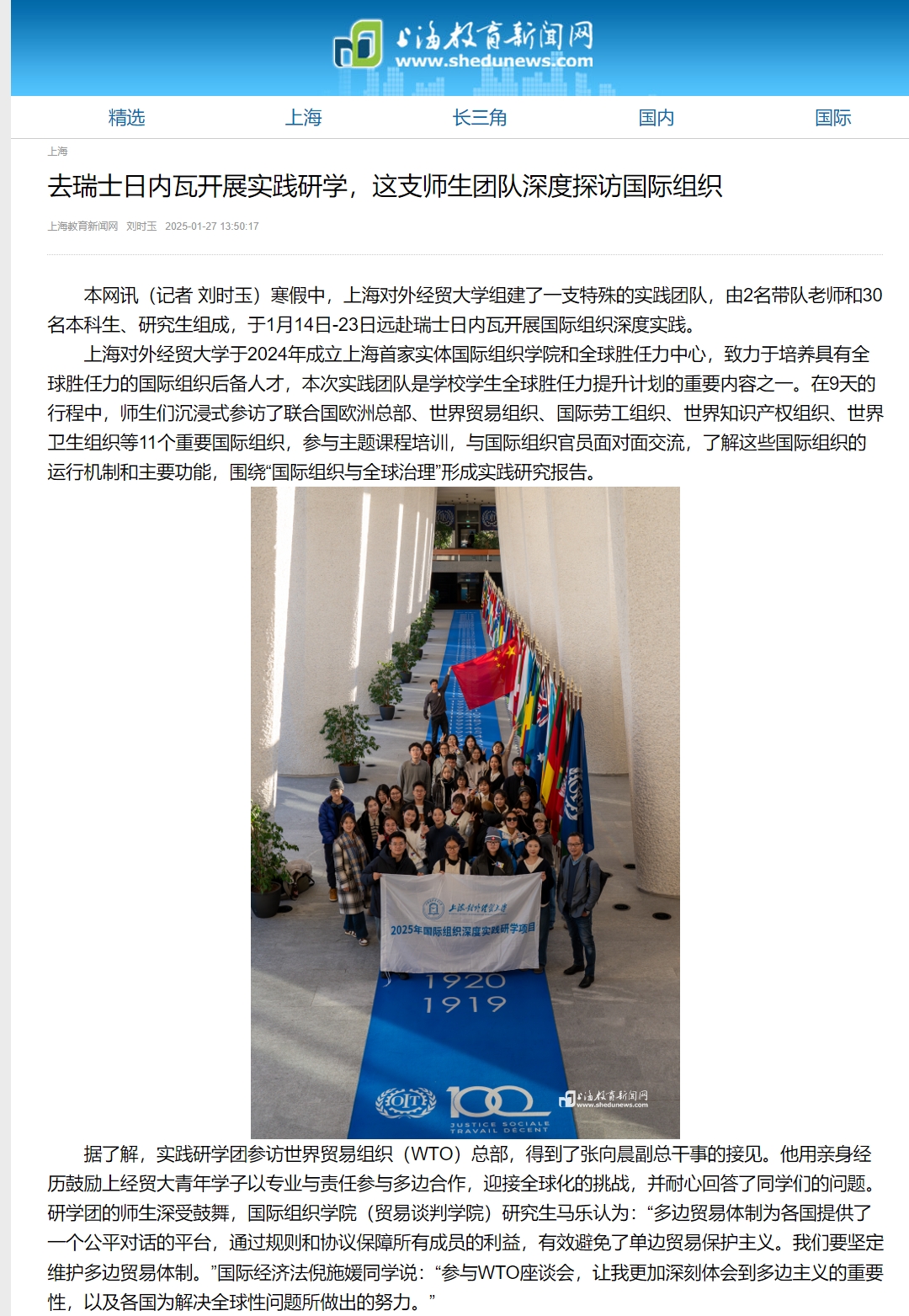 2025年寒假,上海对外经贸大学国际组织学院(贸易谈判学院)、全球胜任力中心共同举办国际组织深度实践研学项目,来自全校30名本科生和研究生,在2名老师的带队下,远赴瑞士日内瓦实践研学。研学期间,师生们在9天内沉式参访了联合国欧洲总部、世界贸易组织、国际劳工组织、世界知识产权组织等11个重要国际组织,参与主题课程培训,与国际组织官员面对面交流,了解这些国际组织的运行机制和主要功能,及其对国际事务的影响。实践研学活动获光明日报、文汇报、中国教育报、青年报、上观新闻、东方网、上海教育新闻网等多家媒体报道。