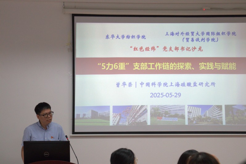529日,上海对外经贸大学国际组织学院(贸易谈判学院)党委与东华大学纺织学院党委在东华大学纺织学院会议室开展共建活动,并联合开展“红色经纬”党支部书记沙龙活动。活动邀请中国科学院上海硅酸盐研究所信息功能材料与器件研究中心党支部书记曾华荣作主题讲座。东华大学纺织学院党委书记李佳耀、上海对外经贸大学国际组织学院(贸易谈判学院)党委书记刘素贞、东华大学纺织学院党委副书记寿晨燕、上海对外经贸大学国际组织学院(贸易谈判学院)党委副书记程栋出席活动,双方教师党支部书记、部分教师党支部委员、学生党支部书记、专职组织员、专职党务干部、学生党建辅导员参加活动。活动由李佳耀主持。