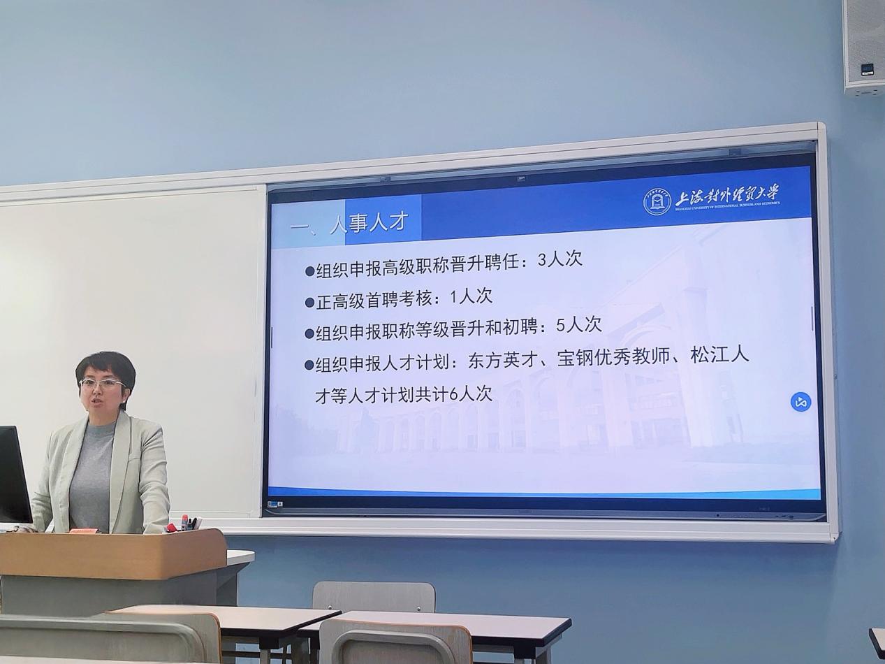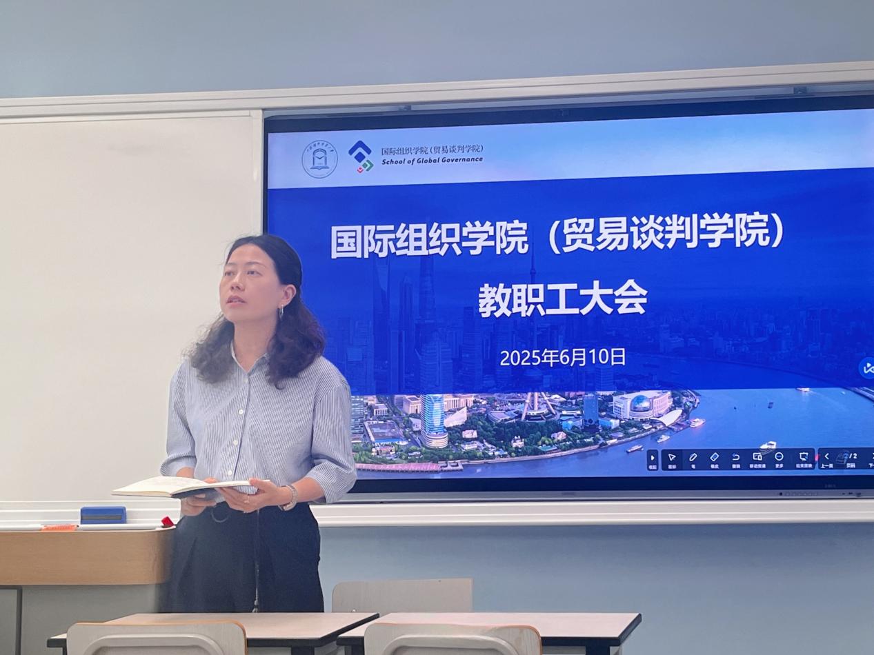 6月10日下午,国际组织学院(贸易谈判学院)教职工大会在松江校区召开。学院领导班子及全体教职工参加了会议,会议由学院党委书记刘素贞主持。
