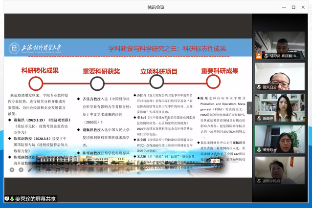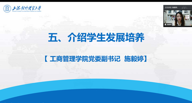 工商管理学院党委副书记施毅婷介绍学生发展培养体系。她谈到,工商管理学院作为我校“三全育人”综合改革试点单位,以推动人才培养理念和培养方式变革为着眼点,聚焦“实践育人”生态圈建设,调动一切积极因素,推动基层党建、专业课实践教学、社会实践、志愿服务、网络思政等载体有机融合,全方位为学生成长成才保驾护航。