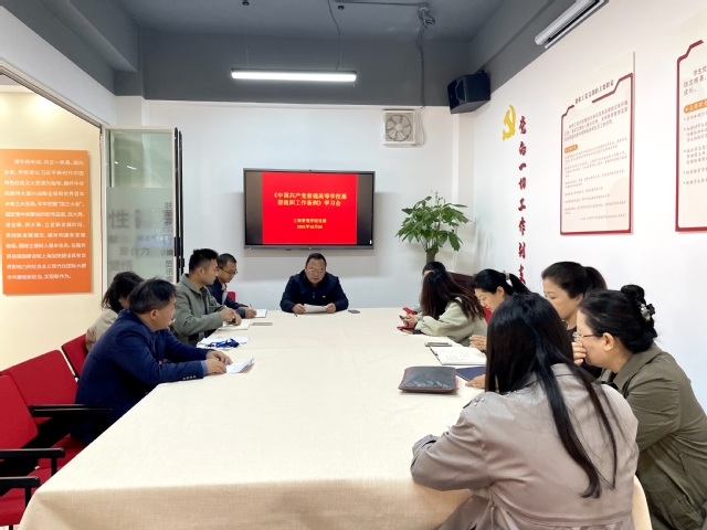《中国共产党普通高等学校基层组织工作条例》对高校基层党组织工作作出全面规范,体现了近年来高校党建工作的理论、实践和制度创新成果,是新时代高校党的建设的基本遵循。为了深入学习贯彻落实好《条例》提出的相关要求,工商管理学院党委于2021年10月29日在党建服务中心召开《中国共产党普通高等学校基层组织工作条例》集体学习会,参加集体学习的有学院党委委员、学院支部书记,会议由学院党委书记武增勇主持。