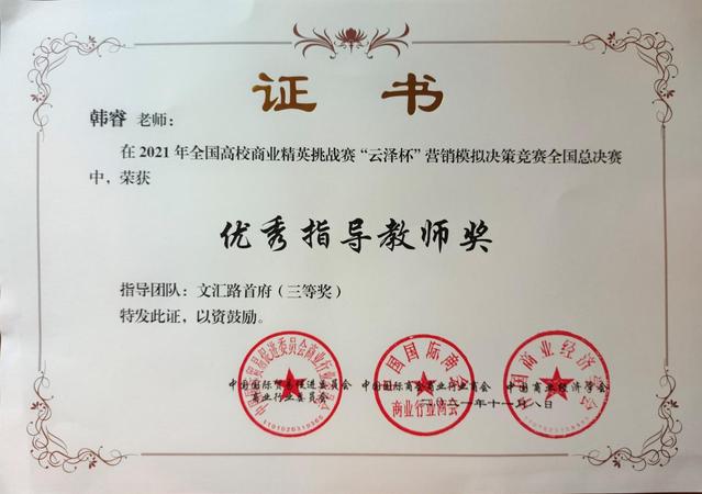 此次竞赛中,工商管理学院市场营销系的韩睿老师在知识赛、 预赛和全国总决赛中,全程为参赛选手提供报名帮助、赛事指导和专业支持,韩睿老师也荣获此次全国总决赛的“优秀指导教师奖”。