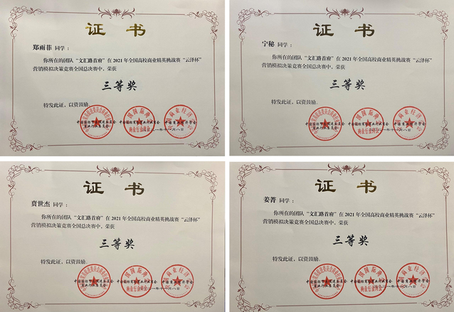 2021年11月7日,由中国商业经济学会,中国国际商会商业行业商会,中国国际贸易促进委员会商业行业委员会联合主办的2021年全国高校商业精英挑战赛“云泽杯”营销模拟决策竞赛全国总决赛落下帷幕,我校学生今年首次参与该赛事,喜获佳绩。经过激烈的角逐和知识赛、预赛的两轮淘汰,由我院2001级人力资源管理专业郑雨菲、文化产业管理专业宁秘和贲世杰、市场营销专业姜菁四名学子组成的文汇路首府队伍从全国各队中脱颖而出,荣获全国总决赛三等奖。