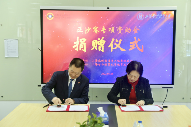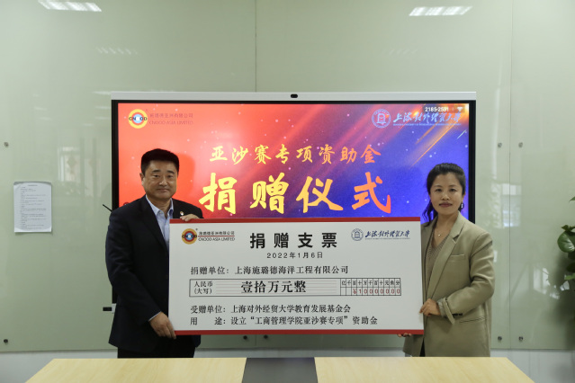 2022年1月6日下午13时,施璐德亚洲有限公司旗下全资子公司——上海施璐德海洋工程有限公司向上海对外经贸大学教育发展基金会捐资10万元人民币,设立“工商管理学院亚沙赛专项资助金”,用于赞助工商管理学院MBA学生创建的“暴走牛排”户外俱乐部组队参加2022年第十一届亚太地区商学院挑战赛。此次捐赠仪式旨在探索校企合作的发展模式,搭建校企合作平台,以培养人才,成就人才,这是施璐德亚洲有限公司第六次捐赠资助我校MBA亚沙赛。施璐德亚洲有限公司董事长池勇海博士、首席执行官李燕飞、首席运营官丁林生、工会主席耿志中,我校校友工作联络处处长兼教育发展基金会秘书长晏琼、副秘书长俞磊,工商管理学院副院长王朝晖、副院长左鹏共同出席本次捐赠仪式。