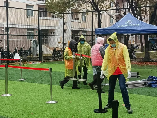 为进一步加强社区疫情防控力度,全方位做好后勤保障工作,工商管理学院师生积极配合社区物业投身到核酸检测场地搭建工作中。2022年3月21日,在党支部书记崔延顺老师的带领下,工商管理学院的志愿者同学们有序进入到社区足球场,在雨中开始了场地的布置。恶劣的天气并没有影响到学院师生的服务热情,在雨中学院老师和同学们身着红色马甲和雨衣进行分工合作,高效的完成了场地和道路的划分、帐篷的搭建,以实际行动奏响了疫情防控阻击战的“冲锋号”。工商管理学院师生志愿者们全力以赴,为学校顺利开展新一轮核酸检测、筑牢学校师生健康和安全防线奉献了自己的坚实力量。