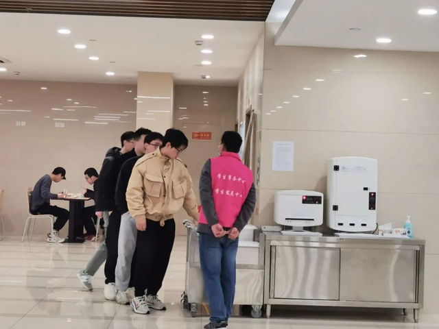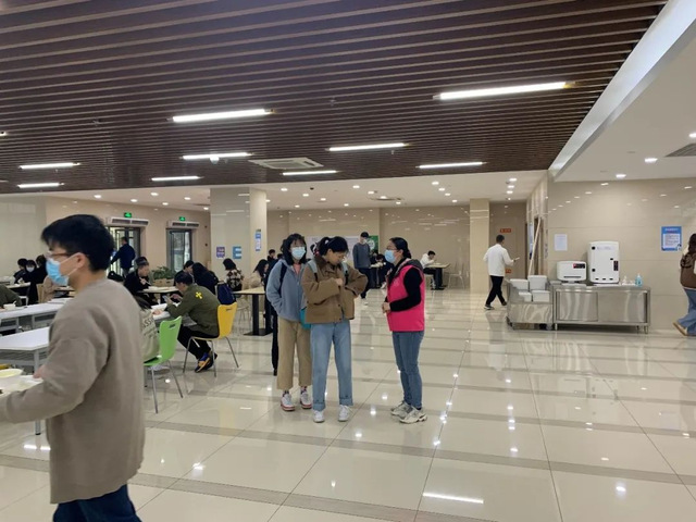 在四位志愿者同志积极地引导下,来食堂就餐的同学,排队打饭时保持距离、戴好口罩,就座吃饭时保持间隔,用餐完毕时重新带好口罩有序离开,使同学们整个用餐过程,时刻保持对疫情的警惕,对疫情的防控。