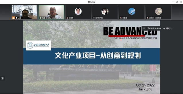 2022年10月25日下午,杨妈妈(广富林)幸福产业文创园区总经理朱斌应邀为我校文化产业管理专业的本科生、研究生作了一场题为“文化产业项目—从创意到规划”的线上专题讲座,线上讲座由文化产业管理系主任李建军主持,工商管理学院副院长王朝晖全程参加了讲座。