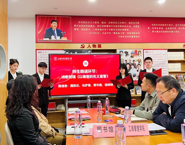 回首百年峥嵘路,矢志不渝跟党走是中国青年百年奋斗的宝贵财富。工商管理学院学生第三党支部学生党员杨婷婷、入党积极分子马梦情、聂凯伦、黄华鼎共同朗诵诗歌《以青春的名义宣誓》,以青春之诗咏青春之志,传承红色基因。