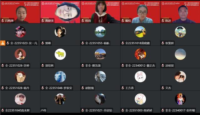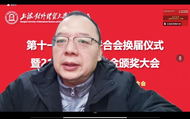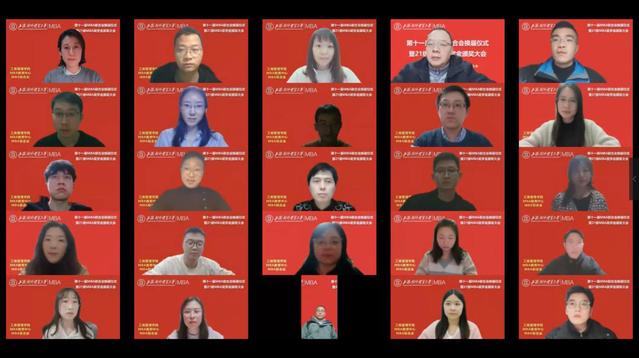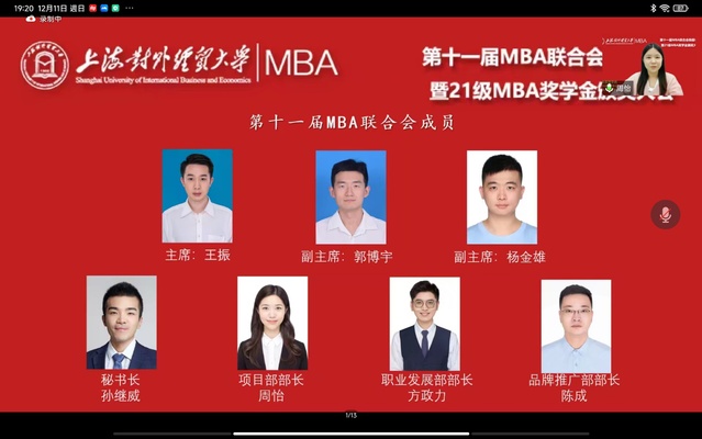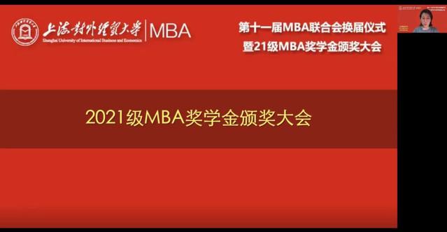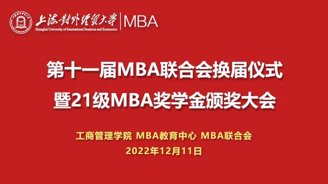 2022年12月11日,上海对外经贸大学第十一届MBA联合会换届仪式暨21级MBA奖学金颁奖大会在云端隆重举行。工商管理学院党委书记武增勇,副书记张瑞娟,MBA教育中心综合事务黄玲、学生事务蔡莹莹,2022级和2021级MBA全体学生参加了此次大会。大会由第十一届联合会主席王振主持。