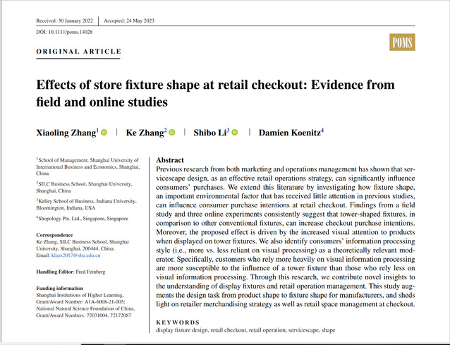 工商管理学院张晓灵教授作为第一作者与合作者完成的“Effects of Store Fixture Shape at Retail Checkout: Evidence from Field and Online Studies”一文发表在Production and Operations Management (POMS) 2023年32卷第10期。