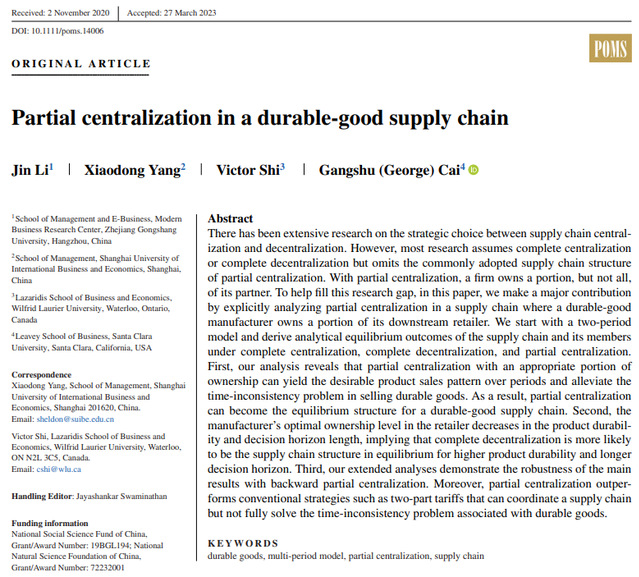 同时,工商管理学院杨晓东老师作为通讯作者的论文《Partial Centralization in a Durable-Good Supply Chain》在国际商科顶级期刊Production and Operations Management (POM) 正式发表。这是杨晓东老师自2019年调入我校以来发表的第二篇国际商科顶级期刊论文。