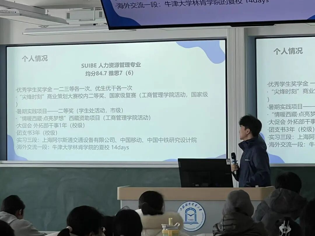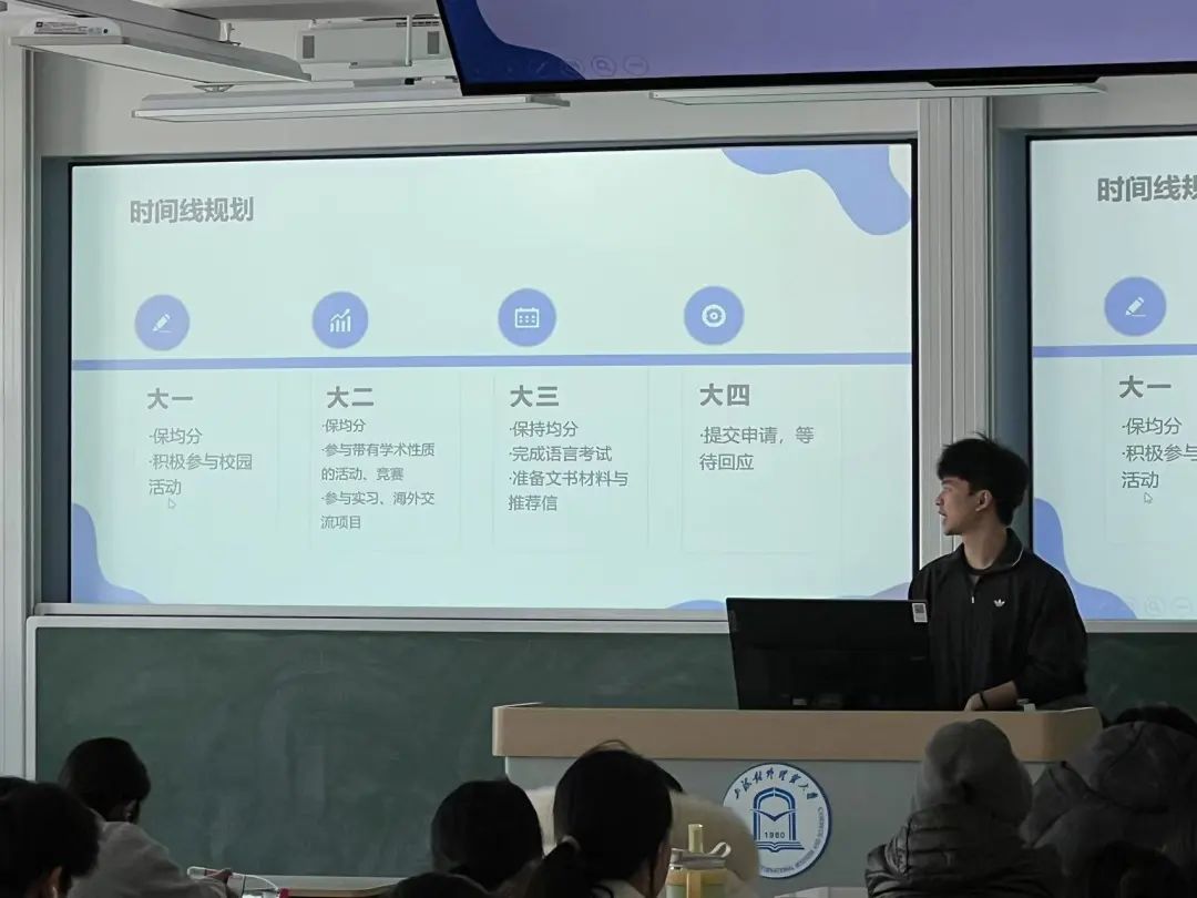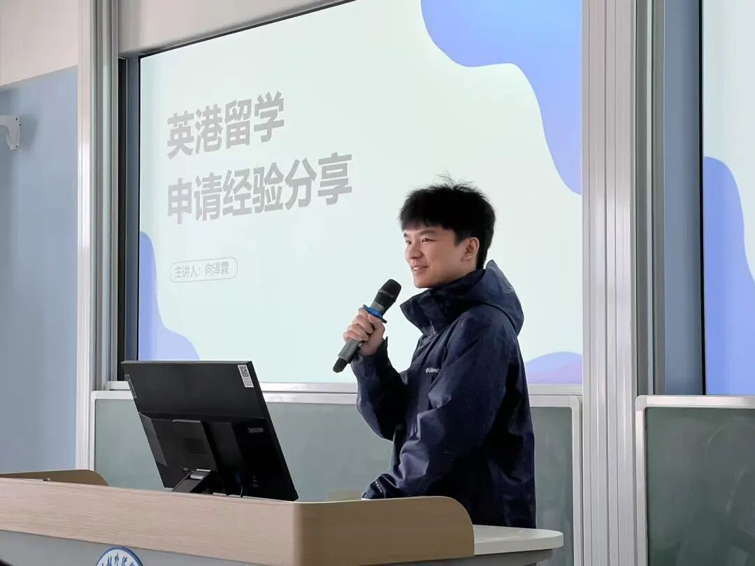 向泽霖同学由自身引入,分别从校内成绩、获奖情况、实践经历等方向,为同学们展示英港留学申请的 “通关秘籍”。他详细讲解了如何充分利用丰富的校内资源,例如专业的课程体系、优质的师资力量和多样的实践机会,更好地为留学做准备。此外,向泽霖同学还分享了真实详尽的个体申请案例,涵盖选课宝典和时间线规划等,为同学们提供了极具参考价值的借鉴和启发。