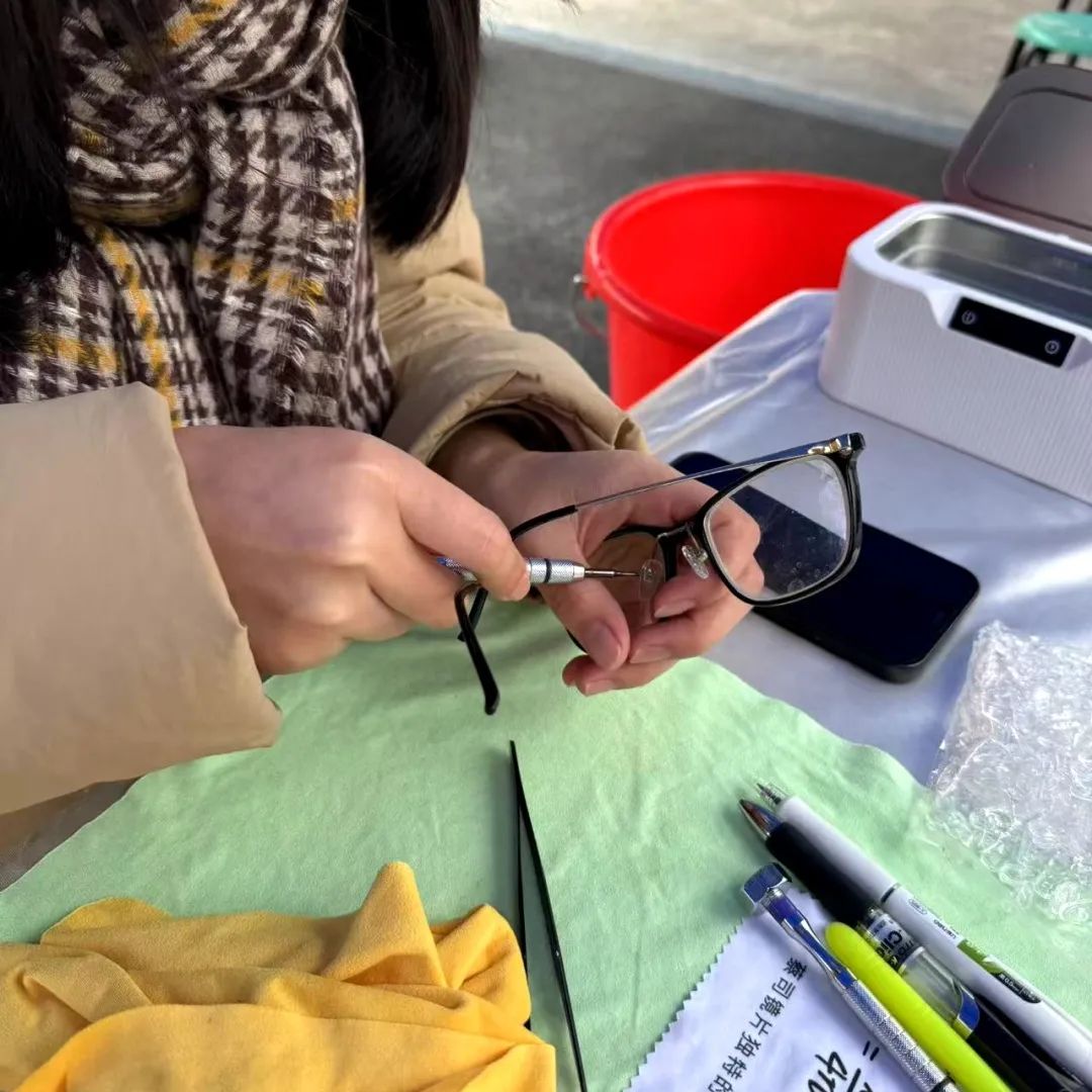 眼镜清洗修理区域也围聚了不少师生,工作人员用专业的清洗液和工具,仔细地对每一副眼镜进行擦拭清洗,让镜片瞬间变得清晰透亮。对于镜架出现松动、变形的眼镜,他们则运用小巧的工具,耐心地进行调整、修理,确保眼镜佩戴舒适、稳固。这一服务贴心地关照到了师生们用眼健康方面的需求,实实在在地为师生们解决了眼镜使用过程中的困扰。