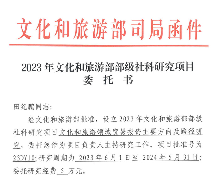 近日文化和旅游部科技教育司正式公布了2023年文化和旅游部部级社科研究项目立项委托书,田纪鹏副教授负责申报的《文化和旅游领域贸易投资主要方向及路径研究》(23DY10)获批立项。
