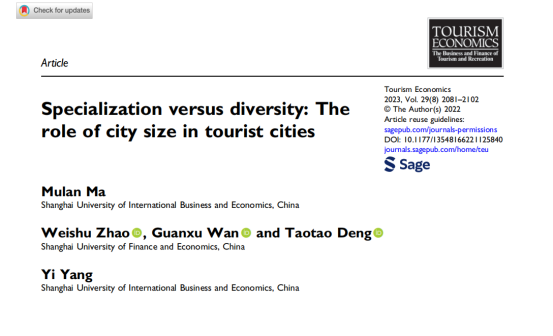 近日,我院马木兰副教授作为第一作者撰写的论文“Specialization versus Diversity: The Role of City Size in Tourist Cities”在《Tourism Economics》期刊正式发表。《Tourism Economics》为旅游管理领域国际权威期刊,经济学类SSCI一区期刊,影响因子为4.4,属于我校国际三类期刊。