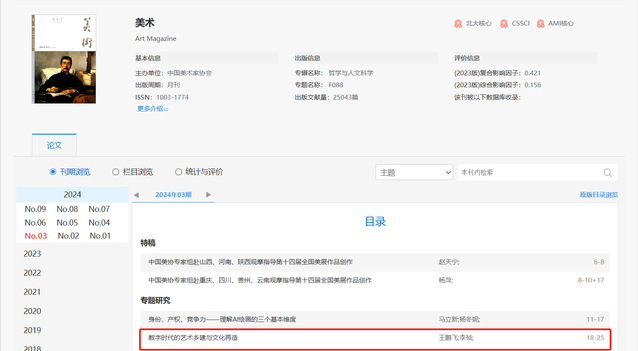 近日,我院王鹏飞博士作为第一作者的论文《数字时代的艺术乡建与文化再造》在《美术》期刊发表。《美术》创刊于1950年,是由中国文学艺术界联合会主管、中国美术家协会主办的学术刊物,也是CSSCI、北大核心来源期刊。
