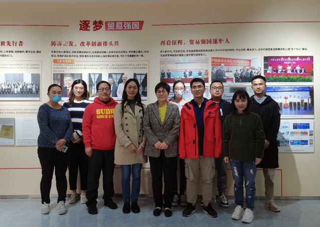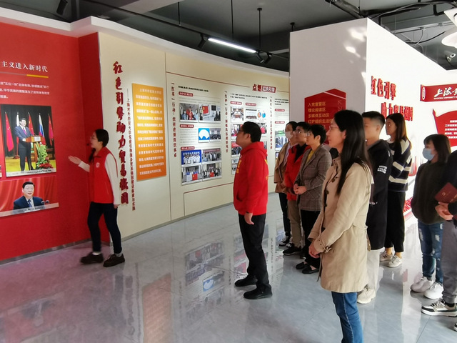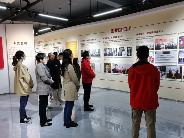主题党日活动共分为三部分内容。第一部分是全体党员在志愿者的带领下参观了党建活动中心,通过志愿者的讲解,学习了党的历史进程、我校的党组织体系和红色引擎助力贸易强国等内容。