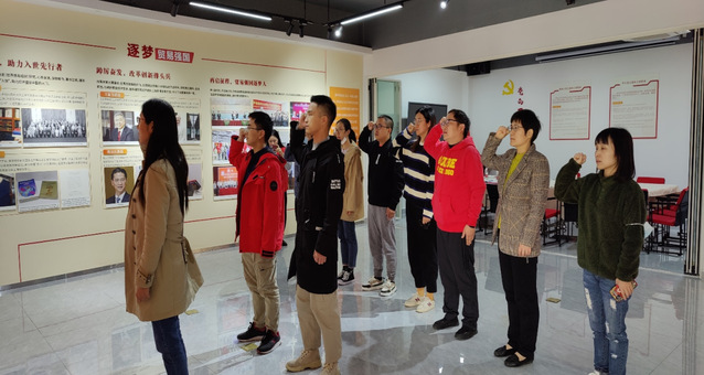 第二部分是为财务处新发展党员孟子平和吴学松同志举行简短而庄重的人党宣誓仪式。期间,大家先起立听奏《国际歌》,两名老党员同志为两名新党员同志佩戴了党徽。支部书记殷枫在党旗面前领读誓词,两名新党员跟读,其他党员一起重温入党誓词。之后,两名新党员依次做了表决发言,向党组织做出了庄严的承诺。殷枫同志希望每一名党员都要铭记这个神圣的时刻,终身践行入党誓词,发挥好党员先锋模范作用。