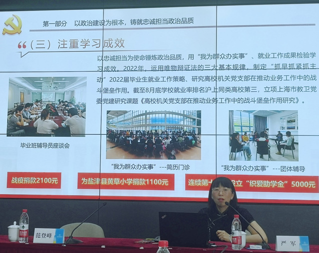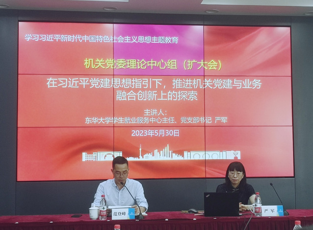 为进一步聚焦重点学习内容,推进主题教育走深走实,5月30日上午,机关党委召开理论中心组(扩大)专题学习习近平党建思想,深化机关党建与业务工作融合促进。会议邀请全国高校样板党支部创建单位——东华大学学生就业服务中心党支部书记、主任严军作主题为《在习近平党建思想指引下,推进机关党建与业务融合创上的探索》的辅导报告。机关全体党支部书记、支部委员和机关中层干部参加,机关党委书记范登峰主持会议。