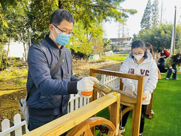 在邂逅小院,师生党员悉心劳作,为小院的特色屏风刷上木油,油漆味丝毫不影响大家的劳动热情,所有屏风焕然一新。