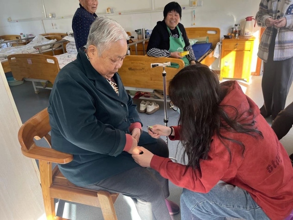 在老人居住区,党员师生一边为老人们修剪指甲,一边与老人话家常。老人们脸上洋溢着幸福的笑容,为党员师生细心、耐心的服务点赞。