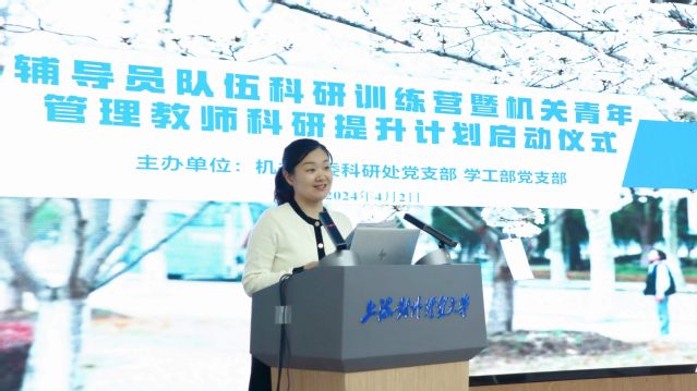 缪韵笛在致辞中表达了对科研处的感谢。她介绍了此次训练营的开设背景与初衷,以及我校《“六阶攀登”辅导员成长共同体》上海高校“时代新人铸魂工程”培育项目高校辅导员名师工作室的建设情况。她强调,辅导员坚持做科研既是工作岗位必需,亦是自身发展所需,希望全体辅导员通过本次训练营培养科研意识、提升科研能力,实现从“0”到“1”的突破、从“1”到“N”的累积,用科学研究为工作实践谋篇、布局、赋能。