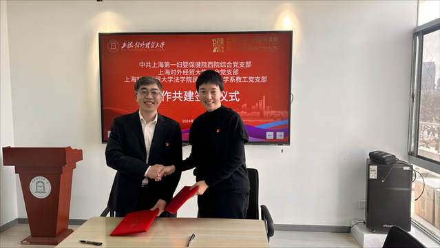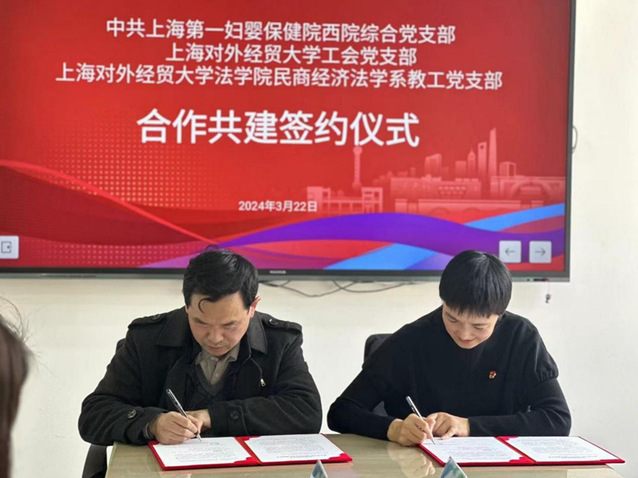 3月22日下午,工会党支部联合“1+2”牵手支部法学院民商经济法学系教工党支部,与上海第一妇婴保健院西院综合党支部在教工之家会议室举行共建签约仪式。上海第一妇婴保健院西院综合党支部书记张娟、法学院党委书记黄静和机关党委书记范登峰、工会党支部书记唐旭生、法学院民商经济法学系教工党支部书记邾立军以及三个支部的部分党员出席了本次活动。