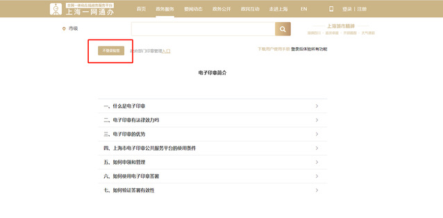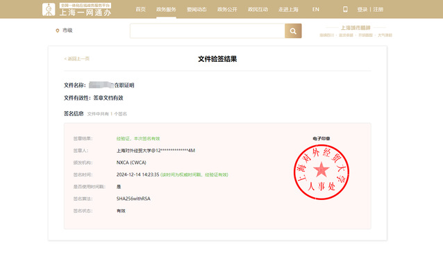 登陆上海市一网通办,通过“不登验签”,上传电子印章文件,查验是否真实有效。