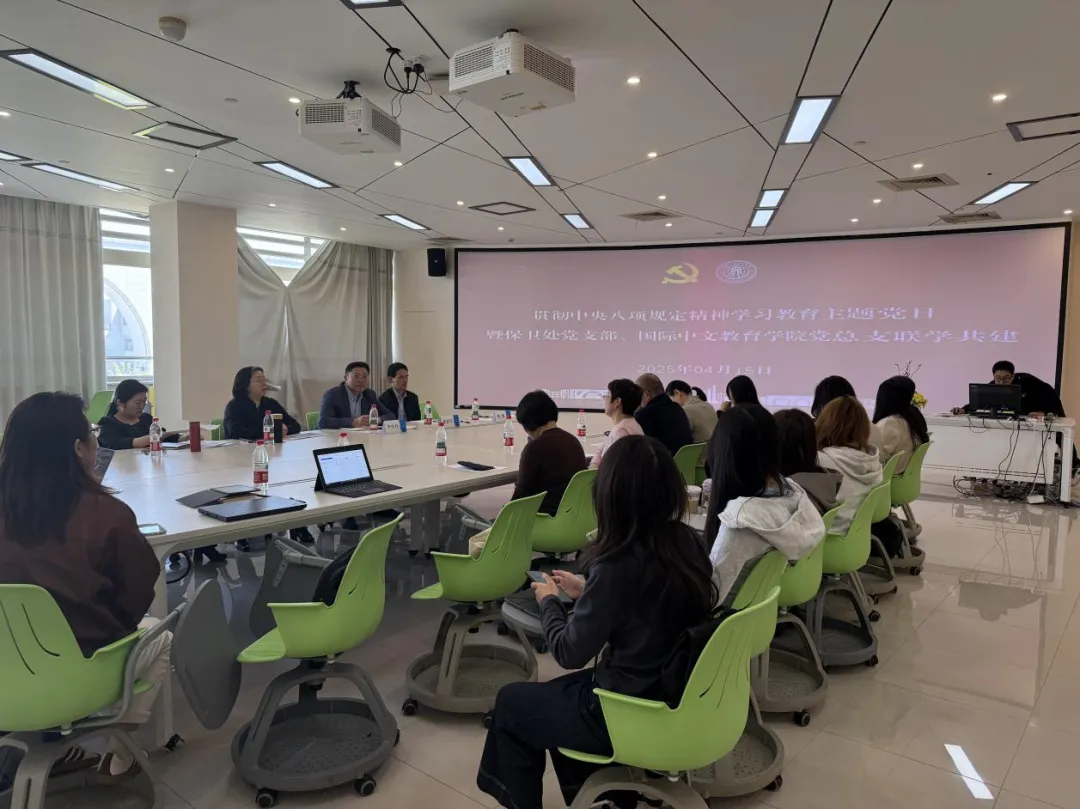 为推进深入贯彻中央八项规定精神学习教育,推动作风建设走深走实,近日,保卫处党支部与国际中文教育学院党总支携手开展“学精神 强作风 办实事”主题党日活动。通过“理论共学+实践联动”双轮驱动,引导党员筑牢纪律防线、厚植为民情怀,以党建引领护航校园安全发展。