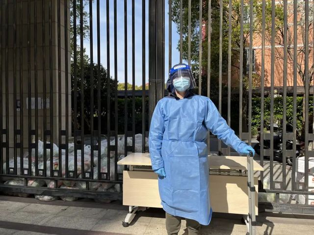 学校纪委委员唐旭生积极参与社区为居民发放蔬菜等生活物资的志愿服务工作