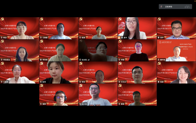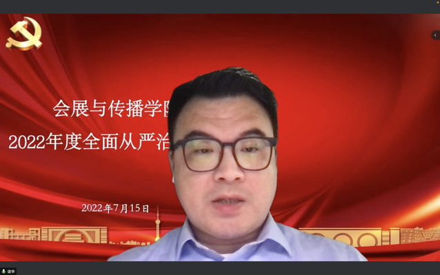 7月15日下午,会展与传播学院党总支在线召开2022年全面从严治党会议,深入学习贯彻落实十九届中央纪委六次全会、上海市第十二次党代会、十一届上海市纪委六次全会和学校2022年全面从严治党暨师德师风建设工作会议精神,学院党政班子成员,系主任、党支部书记、纪检委员、学院办公室主任、组织员参加会议,会议由学院党总支书记谈华主持。