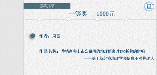 最终,本次会院论坛中,2018级周雪同学《承销商和上市公司间的地理距离对IPO折价的影响——基于新经济地理学和信息不对称理论》一文受到评委老师一致好评,以最高分荣获本届论坛一等奖。周雪同学在感言中表示,这篇论文她用了非常多的时间去调研数据、收集资料,与同学和导师多次讨论几易其稿,现在还是深感有很多不足之处可以继续改正,感谢每位评委对自己的点评,会继续努力科研,修改论文争取发表在优秀期刊上。