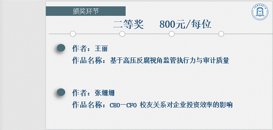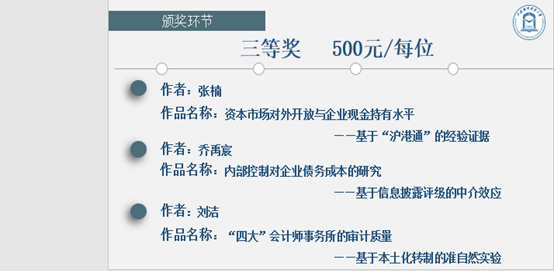 在论坛最后,会计学院副院长杨慧辉为本届学术论坛宣布评选结果并做致辞,希望同学们能坚持学术道路,提升学术能力,营造良好学院学术氛围,在学术研究中找寻个人使命,在科研的道路上继续求索,争取更大成就。