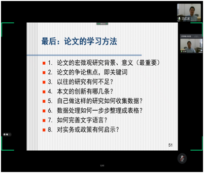 讲座最后沈教授着重分享了公司财务的研究方法、论文的学习方法、公司财务的学习方法以及研究的近年选题等。沈教授强调学术研究的特点是先从宏观背景出发,利用微观数据,融合财务理论,而学术研究与上课不同,做学术研究强调的是创新和与众不同。他希望研究生们能多研究新问题并加强与身边人的交流合作。