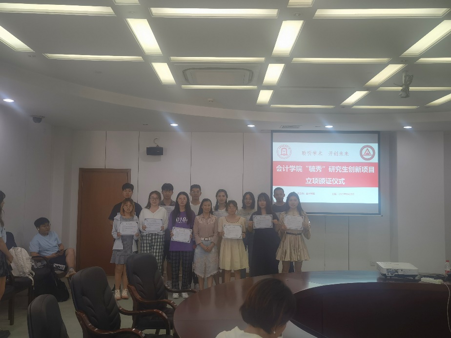 随后,会议举行了会计学院“毓秀”科研创新项目立项仪式。杨慧辉副院长为获得立项的项目负责人,颁发了立项证书。此次学院“毓秀”科研创新项目,充分考虑学硕、专硕不同研究生群体的科研愿景,分类设立高标准的结项标准。经学生自主申报、导师严格审核并推荐,学院组织校外专家双盲评审后,择优立项资助15个项目。