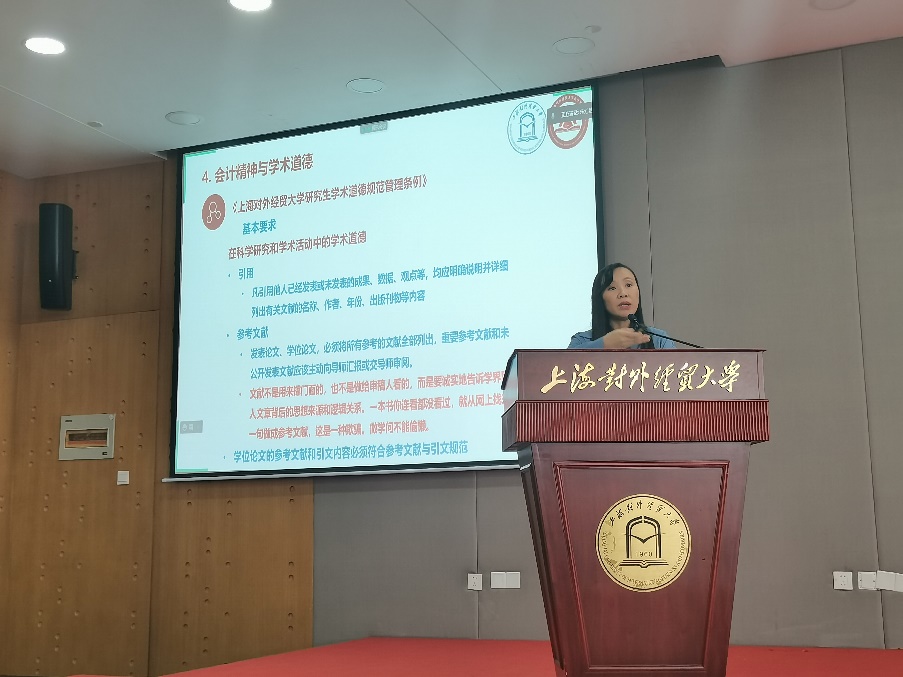 杨慧辉以中概股的两次信任危机反思为引,就会计精神中不可或缺的诚信品格,重点结合研究生的科学研究活动强调了学术诚信是学术创新的基石。她通过现实中一些硕士研究生学术不端的多个典型案例,分别从国内外两个视角详细地剖析了学术不端的定义、形式以及常见做法,并深入讲解了对于学术不端的相应处罚措施,进而强调作为研究生应当深刻认识到学术规范、科研诚信的重要性,在科学研究和学术活动中要追求科研真理,恪守学术道德,用实际行动践行在新生开学典礼上作为会计人的诚信宣誓。